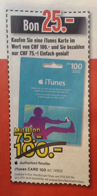Und auch in der Schweiz gibt es aktuell wieder etwas zu sparen. Hier kann man bis Sonntag, den 04. November bei Inter Discount satte 25% Rabatt auf die CHF 100,- iTunes-Karten abstauben. Erforderlich ist hierfür lediglich ein Bon aus dem aktuellen Inter Discount Porspekt, der in den Filialen ausliegt. (mit Dank an Francesco!)