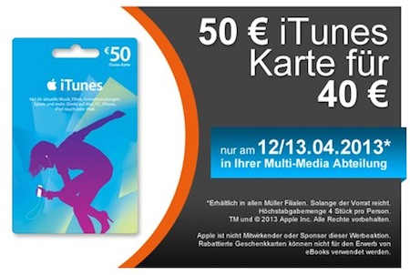 Bevor heute Abend noch die allwöchentlichen AppStore Perlen auf der Agenda stehen, gibt es kurz vorher noch einen schnellen Tipp für alle Schnäppchenjäger. Nur heute und morgen hat die Drogeriemarktkette Müller, nämlich noch ein Angebot aufgenommen, bei dem die iTunes-Geschenkkarten zum vergünstigten Preis angeboten werden. Dort erhält man aktuell einen Rabatt von 20% auf die iTunes-Karten mit einem aufgedruckten Wert von € 50,-. Aber Achtung: Die Aktion gilt nur bis, Samstag, den 13. April 2013, bzw. solange der Vorrat reicht. Die Anzahl der Karten pro Kauf ist dabei auf vier Stück pro Kunde begrenzt. Man sollte also im Zweifel schnell sein, um noch rechtzeitig zuschlagen zu können. Schließlich haben die Karten ja kein Verfallsdatum. Der aufgedruckte Wert der Karten kann sowohl für Musik, als auch für Fernsehserien, Filme und Einkäufe im Mac- und iOS-AppStore genutzt werden. (mit Dank an Christopher und Peter!)