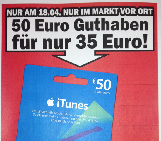 Gegen Ende der Woche gibt es noch einmal einen schnellen Tipp für alle Schnäppchenjäger. Nur heute hat die Elektronikmarktkette Media Markt nämlich noch ein Angebot aufgenommen, bei dem die iTunes-Geschenkkarten zum vergünstigten Preis angeboten werden. Dort erhält man aktuell einen Rabatt von satten 30% auf die iTunes-Karten mit einem aufgedruckten Wert von € 50,-. Hierdurch werden an der Kasse also lediglich € 35,- fällig. Aber Achtung: Die Aktion gilt nur heute, Donnerstag, den 18. April 2013, bzw. solange der Vorrat reicht. Die Anzahl der Karten pro Kauf ist anscheinend nicht begrenzt. Man sollte also im Zweifel schnell sein, um noch rechtzeitig zuschlagen zu können. Schließlich haben die Karten ja kein Verfallsdatum. Der aufgedruckte Wert der Karten kann sowohl für Musik, als auch für Fernsehserien, Filme und Einkäufe im Mac- und iOS-AppStore genutzt werden. (mit Dank an Raphael, Ingo, Julian, Marcus und Jan!)