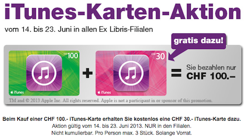Zum Ende der Woche noch einmal einen besonderen Gruß an unsere Nachbarn in der Schweiz, verbunden mit einem Hinweis auf gute Nachrichten für alle dort beheimateten Schnäppchenjäger. Aktuell gibt es in unserem Nachbarland nämlich wieder ein Angebot mit vergünstigten iTunes-Geschenkkarten. So ist es aktuell der Buchhändler Exlibris, der die Karten zum Sonderpreis verkauft. Käufer einer Karte mit einem aufgedruckten Guthaben von CHF 100,- erhalten dort eine weitere Karte mit einem Guthaben von CHF 30,- gratis dazu. Aber Achtung: Die Aktion gilt nur bis Sonntag, den 23. Juni 2013, bzw. solange der Vorrat reicht. Die Anzahl der Karten pro Kauf ist auf drei Stück pro Kunde begrenzt. Man sollte also im Zweifel schnell sein, um noch rechtzeitig zuschlagen zu