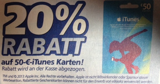die Karten zum Sonderpreis verkaufen. Käufer einer Karte mit einem aufgedruckten Guthaben von € 50,- erhalten bei real,- einen Rabatt von 20%, zahlen an der Kasse also nur € 40,-. Bei Marktkauf sind ab heute sogar sämtliche iTunes-Geschenkkarten um 20% reduziert erhältlich. Aber Achtung: Die Aktioneb gelten nur bis Samstag, den 22. Juni 2013, bzw. solange der Vorrat reicht. Die Anzahl der Karten pro Kauf ist offenbar nicht begrenzt. Man sollte also im Zweifel schnell sein, um noch rechtzeitig zuschlagen zu können. Schließlich haben die Karten ja kein Verfallsdatum. Der aufgedruckte Wert der Karten kann sowohl für Musik, als auch für Fernsehserien, Filme und Einkäufe im Mac- und iOS-AppStore genutzt werden. (mit Dank an Peter und Roman!)