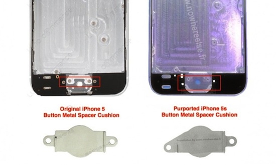 Bekommt das iPhone 5S einen Fingerabdrucksscanner im Home-Button oder nicht? Die in der Vergangenheit in dieser Hinsicht sehr zuverlässigen französischen Kollegen von Nowhereelse präsentieren aktuell Fotos, welche durchaus darauf hindeuten könnte, dass Apple den Sensor in der Tat verbauen wird. Zu sehen ist dabei unter anderem die vermeintliche Rückseite des iPhone 5S, die wie zu erwarten größtenteils unverändert bleibt. Einige Details präsentieren sich allerdings doch gegenüber der Rückseite des aktuellen iPhone 5 leicht verändert, so auch der Bereich um den Home-Button herum. Der dort zu findende metallene Abstandhalter hat im iPhone 5S offenbar eine veränderte Form. Dies kann (muss aber nicht) auf Veränderungen im Allgemeinen hindeuten. Als erstes kommt einem dabei natürlich der für diese Position erwartete Fingerabdrucksscanner in den Sinn. Letzte Gerüchte sprachen davon, dass sich der Home-Button aus diesem Grund künftig konvex und aus Saphirglas präsentieren wird, im Gegensatz zum bisherigen konkaven Bauteil aus Kunststoff. Auch in der vierten Beta von iOS 7 fanden sich bereits Referenzen, die auf den Sensor hindeuteten.