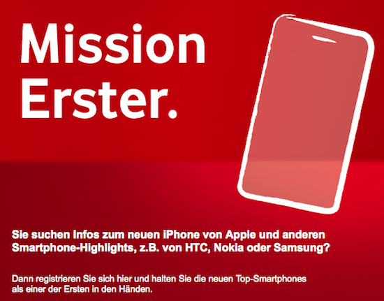 die unzweifelhaft auf den nahenden Verkaufsstart des neuen iPhone zielt. Da man dies ohne eine Ankündigung von Apple aber natürlich nicht direkt aussprechen darf, bewirbt man die Mission als Programm über das man sich als Bestandskunden über den Verkaufsstart neuer Smartphones informieren lassen kann. Vodafone informiert einen nach der Registrierung dann sobald die Geräte verfügbar sind und beispielsweise zusammen mit einer Vertragsverlängerung erworben werden können. Es ist zu erwarten, dass auch das Premieren-Ticket der Telekom in Kürze eine Neuauflage erfahren wird. (via iFun)