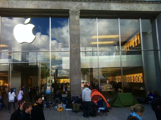Heute Nacht ab 01:01 Uhr werden sich sowohl das iPhone 5c als auch das iPhone 5s im Apple Online Store bestellen lassen. Während das iPhone 5c bereits seit einer Woche vorbestellt werden kann, verzichtete Apple (wohl aufgrund von Lieferengpässen) auf eine Vorbestellphase beim iPhone 5s. Dementsprechend groß dürfte der Andrang auf die Apple-Server heute Nacht werden. Während in Asien inzwischen die Apple Stores in Vorbereitung auf die Bestellmöglichkeit vom Netz genommen wurden, haben sich auch in Deutschland inzwischen die ersten Wartenden vor den Apple Retail Stores eingefunden, um morgen ab 08:00 Uhr dort ganz sicher eines der neuen iPhones ergattern zu können. Ich drücke allen Wartenden die Daumen, dass das Wetter heute Nacht hält! (mit Dank für die Fotos an Andreas, Gerrit und Andreas!)
