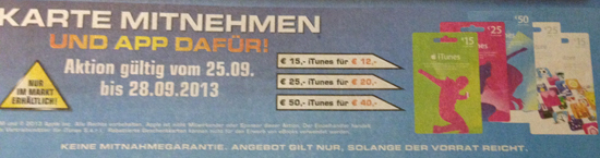 AppStore-Karten. Aber Achtung: Die Aktion gilt nur bis Samstag, den 28. September 2013, bzw. solange der Vorrat reicht.