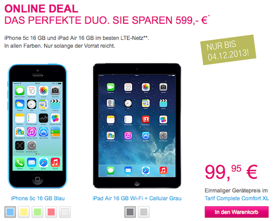 Heute Morgen erst war die Telekom in den News mit einem Pilotprojekt, bei dem in Bonn an 150 über die Stadt verteilten HotSpots 30 Minuten kostenloses Internet für jedermann angeboten wird. Am späten Nachmittag gibt es nun noch ein Angebot vom rosa Riesen, das vor allem für all diejenigen interessant ist, die auf der Suche nach einem neuen iPhone UND einem neuen iPad sind. In einem nur online verfügbaren Angebot bietet die Telekom ab heute und nur bis zum 04.12.2013 das iPhone 5c zusammen mit dem neuen iPad Air im Paketpreis für nur € 99,95 an. Voraussetzung ist der Abschluss eines Complete Comfort XL Vertrages mit 24 Monaten Laufzeit. Das Angebot kann sowohl Privatkunden, als auch von Geschäftskunden in Anspruch genommen werden, gilt aber nur für Neukunden. Der Complete Comfort XL Tarif beinhaltet eine Telefon Flat, SMS Flat, Daten Flat mit 2 GB inklusive LTE und bis zu 100 MBit/s, eine HotSpot Flat, VoIP, 4 x Travel & Surf Weekpass, 50 Minuten pro Monat im Ausland und MultiSIM und kostet monatlich € 69,45. Bei den Geräten handelt es sich um das iPhone 5c mit 16 GB (alle Farben) und das iPad Air WiFi+Cellular mit 16 GB (alle Farben). Alternativ kann das Angebot auch mit dem Tarif Comfort Complete L gebucht werden. Hier kosten die Geräte zusammen einmalig € 249,95, der monatlicher Tarifpreis liegt dann bei € 60,45 für Telefon Flat, SMS Flat, Daten Flat mit 1 GB inklusive LTE und bis zu 50 MBit/s, HotSpot Flat, VoIP und 4 x Travel & Surf Weekpass. Ein Klick auf das nachfolgende Bild führt direkt zum Angebot.
