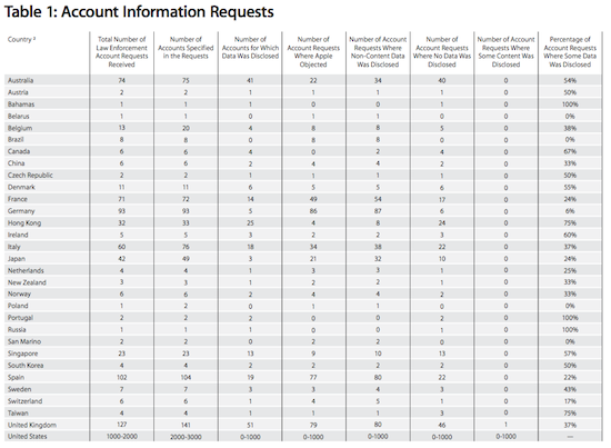 Die Spionage-Affäre rund um die NSA hält uns auch in Deutschland nach wie vor auf Trab. Ich persönlich muss gestehen, dass ich es weniger skandalös finde, dass unsere Bundeskanzlerin abgehört wird, als dass unsere Geheimdienste offenbar nicht dazu in der Lage sind, sie davor zu schützen. Aber nicht nur die Bundesregierung wurde offenbar systematisch ausspioniert, auch Daten von "normalen" Bürgern sollen von der NSA abgefangen, analysiert und ausgewertet worden sein. Erinnert sich noch jemand, wie die ganze Sache ursprünglich ins Rollen kam? Damals wurde neben anderen großen (Internet-)Unternehmen auch Apple im Zusammenhang mit einer angeblichen Datenweitergabe an die NSA genannt. In Cupertino ist man seither bemüht, ein möglichst hohes Maß an Transparenz an den Tag zu legen, was mit den Nutzerdaten passiert. Als aktuelles Beispiel hierfür hat Apple nun ein umfangreiches Dokument (PDF) veröffentlicht, in dem man noch einmal detailliert auf die eigenen Datenschutz-Richtlinien eingeht (via 9to5Mac). Besonders interessant ist zudem eine enthaltene Aufstellung darüber, wie viele Anfragen auf Herausgabe von Daten von Nutzern innerhalb des Europäischen Wirtschaftsraumes Apple von verschiedenen Regierungen und Behörden zwischen Januar und Juni dieses Jahres erhalten hat. Man beachte die unterste Zeile...