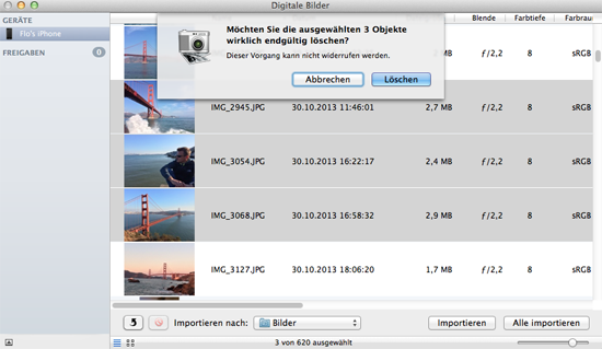 Auf jedem Mac findet sich vorinstalliert eine App namens "Digitale Bilder". Zumindest ich habe mich lange gefragt, wofür diese App wohl gut sein könnte. Eine Antwort darauf habe ich noch immer nicht gefunden, aber immerhin habe ich ein Anwendungsszenario für sie gefunden. So gewährt sie bei angeschlossenem iPhone Zugriff auf die darauf gespeicherten Fotos und dabei dann auch die Möglichkeit, die ausgewählten Bilder in einem Rutsch zu löschen. Wer also mal wieder die auf dem iPhone angehäufte "Fotosammlung" ein wenig ausmisten möchte, ist bei dieser einfachen App bestens aufgehoben.