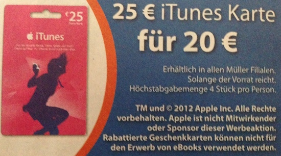 Die neue Woche beginnt wieder einmal mit guten Nachrichten für alle Schnäppchenjäger. Und zwar sowohl in Deutschland, als auch in Österreich: Es gibt wieder vergünstigte iTunes-Geschenkkarten. Dieses Mal sind es die Filialen der Drogeriemarktkette Müller, die die Karten zum Sonderpreis verkaufen. Dort bekommt man in dieser Woche 20% Rabatt auf die iTunes- und AppStore-Karten mit einem aufgedruckten Wert von € 25,-. Aber Achtung: Die Aktion gilt in Deutschland nur bis Samstag, den 01. März 2014 bzw. solange der Vorrat reicht. In Österreich endet die Aktion am Dienstag, den 25. Februar 2014.Die Anzahl der Karten pro Kunde und Einkauf ist auf vier Stück begrenzt. Bei Netto benötigt man einen Coupon aus dem aktuellen Prospekt, mit dem man die € 25,- Karte dort ebenfalls für € 20,- erhält. Hier gilt die Aktion bis Samstag, den 01. März 2014. Man sollte also im Zweifel schnell sein, um noch rechtzeitig zuschlagen zu können. Schließlich haben die Karten ja kein Verfallsdatum. Der aufgedruckte Wert der Karten kann sowohl für Musik, als auch für Fernsehserien, Filme und Einkäufe im Mac- und iOS-AppStore genutzt werden. (mit Dank an Peter, Andreas und Paul!)