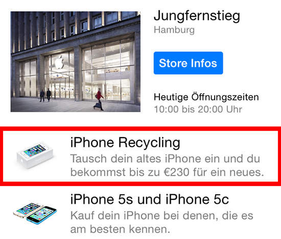 Im August vergangenen Jahres hat Apple zunächst in den USA ein Trade-In-Programm für alte iPhones eingeführtm dessen Start ich seinerzeit bereits fälschlicherweise auch für Deutschland vermeldet hatte. Seiter wurde das Programm auf verschiedene weitere Länder, unter anderem das Vereinigte Königreich, ausgeweitet. Seit heute ist es nun auch in Deutschland möglich, hieran teilzunehmen. Wie auf dem Screenshot unten zu sehen, kann man dabei bis zu € 230,- Gutschrift beim Kauf eines neuen iPhone erhalten, wenn man das alte in Zahlung gibt. Dies ist natürlich immer stark abhängig von Gerätegeneration und Zustand des iPhones. Das Angebot gilt der Meldung in der Apple Store App (kostenlos im AppStore) zufolge für sämtliche Apple Retail Stores in Deutschland. Auch wenn eine offizielle Ankündigung noch aussteht, dürfte der Start des Programms dieses Mal sicher sein, zumal die Meldung identisch ist mit denen in anderen Ländern des Programms. (mit Dank an Tom!)