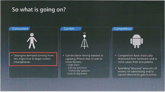 Bereits am Wochenende bin ich kurz auf die interessanten E-Mails von Steve Jobs eingegangen, die der aktuelle Gerichtsstreit zwischen Apple und Samsung zu Tage gefördert hatten. Nun sind weitere Dokumente aufgetaucht, die die aktuellen Gerüchte befeuern, wonach Apple mit der nächsten iPhone-Generation abermals das Display vergrößern wird. Auf den Präsentationsfolien, die auf April 2013 datiert sind, geht Apple auf die Planungen für den Smartphone-Markt 2014 ein und stellt dabei die Frage, warum die Wachstumsraten des iPhone Quartal für Quartal geringer werden. Die passende Antwort liefert man ebenfalls direkt mit. Der Hauptgrund seien Kunden, die kostengünstigere Smartphones mit größerem Display wollen.