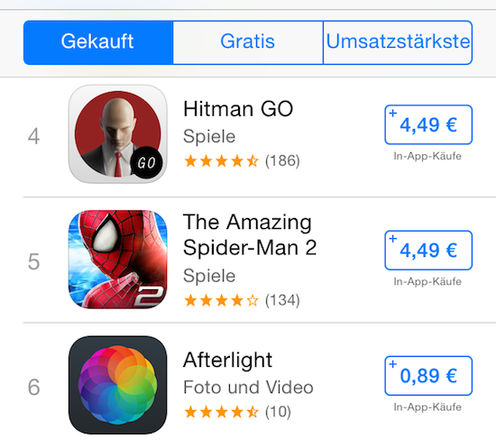 UPDATE: Eine kleine Neuerung hat Apple im mobilen AppStore vorgenommen. Hier werden nun auch direkt in den Chart-Übersichten direkt unter den Kauf-Buttons Hinweise zu möglichen In-App Purchases angezeigt:
