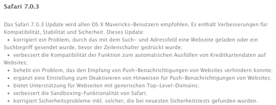 Darüber hinaus steht auch ein Update für Safari auf Version 7.0.3 zum Download bereit, welches sich um verschiedene Fehlerkorrekturen und Verbesserungen kümmert.