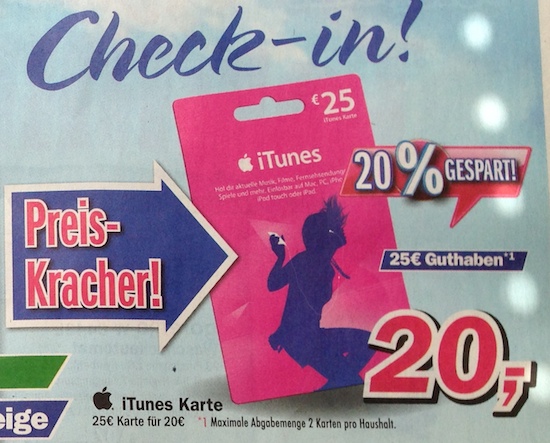 Zu Beginn der Woche gibt es wieder einmal gute Nachrichten für alle Schnäppchenjäger: Es gibt wieder vergünstigte iTunes-Geschenkkarten. Dieses Mal sind es die Filialen der Supermarktkette Famila und die Elektronikmärkte von Telepoint, die die Karten zum Sonderpreis verkaufen. Dort bekommt man in dieser Woche 20% Rabatt auf alle iTunes- und AppStore-Karten mit einem aufgedruckten Wert von € 25,-, zahlt also nur € 20,-. Aber Achtung: Die Aktion gilt nur bis Samstag, den 02. August 2014 bzw. solange der Vorrat reicht. Die Anzahl der Karten pro Kunde und Einkauf ist bei Telepoint auf zwei Karten, bei Famila anscheinend nicht begrenzt. Man sollte also im Zweifel schnell sein, um noch rechtzeitig zuschlagen zu können. Schließlich haben die Karten ja kein Verfallsdatum. Der aufgedruckte Wert der Karten kann sowohl für Musik, als auch für Fernsehserien, Filme und Einkäufe im Mac- und iOS-AppStore genutzt werden. (mit Dank an Christian!)