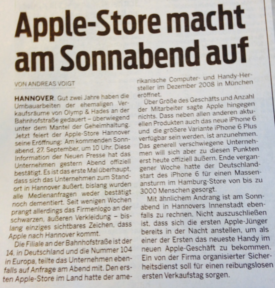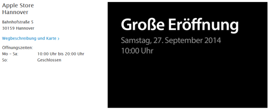 Seit einigen Tagen bereits herrscht große Betriebsamkeit in der hannöverschen Bahnhofstraße. Vor dem dort nun endlich fertig gestellten ersten niedersächsischen Apple Store fuhren beinahe im Stundentakt LKW mit Einrichtung und Produkten vor. Es hat sich also bereits angedeutet, was Apple inzwischen gegenüber der Neuen Presse Hannover bestätigt hat (mit Dank an Lukas für das Foto unten!). Am kommenden Samstag, den 27. September um 10:00 Uhr wird Apple also sein hierzulande 14. Ladengeschäft eröffnen. Inzwischen ist auch der Eintrag auf den deutschen Retail-Webseiten mit dem Hinweis auf die große Eröffnung erschienen. Auf den Reservierungswebseiten zum neuen iPhone taucht der Store ebenfalls bereits auf (mit Dank an Patrick!). Traditionell verteilt Apple auch in Hannover kostenlose