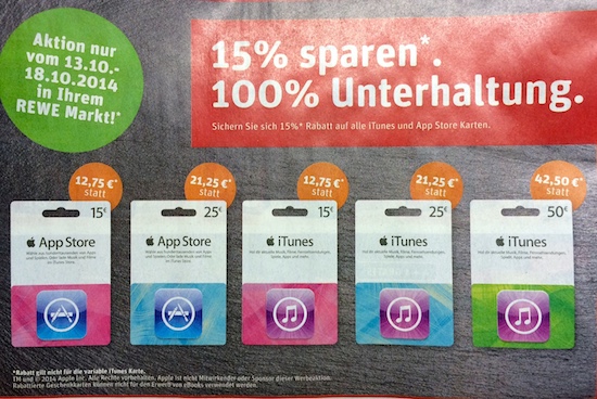 Zu Beginn der Woche gibt es wieder einmal gute Nachrichten für alle Schnäppchenjäger: Es gibt wieder vergünstigte iTunes-Geschenkkarten. Dieses Mal sind es die Filialen der Supermarktkette REWE, die die Karten zum Sonderpreis verkaufen. Dort bekommt man in dieser Woche beim Kauf sämtlicher iTunes- oder AppStore-Karte einen Nachlass von 15%. Aber Achtung: Die Aktion gilt nur bis Samstag, den 18. Oktober 2014 bzw. solange der Vorrat reicht. Die Anzahl der Karten pro Kunde und Einkauf ist anscheinend nicht begrenzt. man sollte also im Zweifel schnell sein, um noch die eine oder andere Karte abzugreifen. Der aufgedruckte Wert der Karten kann sowohl für Musik, als auch für Fernsehserien, Filme und Einkäufe im Mac- und iOS-AppStore genutzt werden. (mit Dank an Sinan und Andreas!)