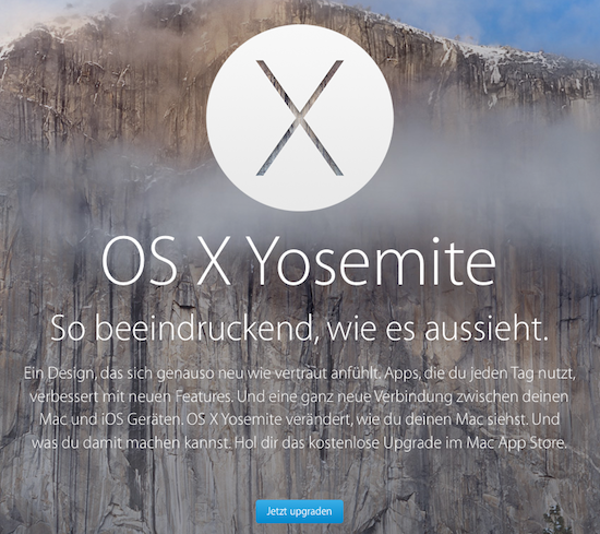 Noch steht OS X Yosemite nicht im Mac AppStore zum Download zur Verfügung. Bis es soweit ist, lohnt eventuell noch ein Blick auf die von Apple veröffentlichten Upgrade-Informationen. Hier findet man alle Infos zu allgemein unterstützter Hardware und auch dazu, welche Funktionen auf welcher Hardware verfügbar sind. Während sich OS X Yosemite grundsätzlich auf verschiedenen Geräten ab dem Jahr 2007 installieren lässt, werden beispielsweise sowohl Handoff und Instant Hotspot, als auch AirDrop zwischen einem Mac und einem iOS-Gerät erst ab dem Baujahr 2012 unterstützt. Als Installationsvoraussetzung für OS X Yosemite wird mindestens OS X in der Version 10.6.8 vorausgesetzt. Ein Blick auf die Informationen kann also in jedem Fall nicht schaden.