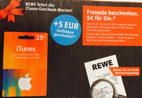 Zu Beginn der Woche gibt es wieder einmal gute Nachrichten für alle Schnäppchenjäger: Es gibt wieder vergünstigte iTunes-Geschenkkarten. Dieses Mal sind es die Filialen der Supermarktkette REWE, die die Karten zum Sonderpreis verkaufen. Dort bekommt man in dieser Woche beim Kauf einer iTunes- oder AppStore-Karte mit einem Wert von € 25,- ein zusätzliches Guthaben von weiteren € 5,- gratis dazu. Hierzu muss der auf den Kassenbon aufgedruckte Code bei iTunes eingegeben werden. Aber Achtung: Die Aktion gilt nur bis Samstag, den 31. Januar 2015 bzw. solange der Vorrat reicht. Die Anzahl der Karten pro Kunde und Einkauf ist anscheinend nicht begrenzt. Man sollte also im Zweifel schnell sein, um noch die eine oder andere Karte abzugreifen. Der aufgedruckte Wert der Karten, sowie das Zusatzguthaben kann sowohl für Musik, als auch für Fernsehserien, Filme und Einkäufe im Mac- und iOS-AppStore genutzt werden. (mit Dank an Uwe und Ralf!)