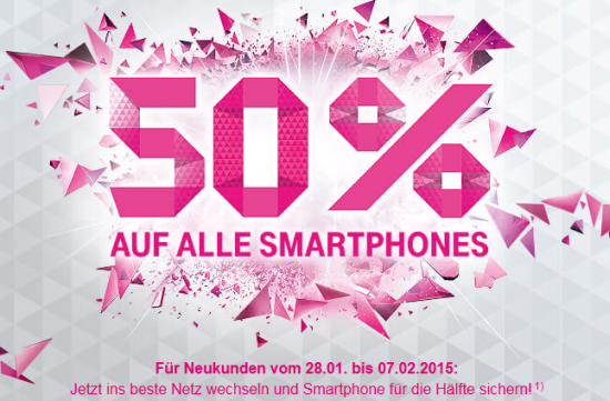 Die letzte Rabattaktion der Telekom ist schon ein paar Tage her. Doch zu Beginn des Jahres lässt sich im meiner Meinung nach besten Netz Deutschlands wieder sparen. Seit heute erhält man als Neukunde satte 50% Rabatt auf sämtliche Smartphone-Preise. Enthalten sind bei diesem Angebot natürlich auch das iPhone 6 und iPhone 6 Plus. Das Angebot gilt bei Abschluss eines Neuvertrages mit einer Laufzeit von 24 Monaten. Hierdurch ist beispielsweise bei einem Vertrag für monatlich € 49,95 Euro das iPhone 6 ab einem Gerätepreis von € 89,- statt der normalen € 179,- enthalten. Bei einem monatlichen Tarifpreis von € 59,- sind es dagegen € 59,- statt der normalen €