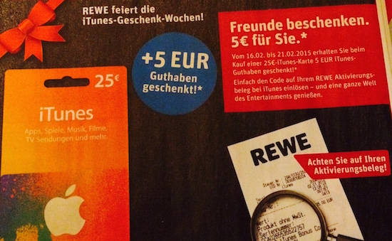 Zu Beginn der Woche gibt es wieder einmal gute Nachrichten für alle Schnäppchenjäger: Es gibt wieder vergünstigte iTunes-Geschenkkarten. Dieses Mal sind es die Filialen der Supermarktkette REWE, die die Karten zum Sonderpreis verkaufen. Dort bekommt man in dieser Woche beim Kauf einer iTunes- oder AppStore-Karte mit einem Wert von € 25,- ein zusätzliches Guthaben von weiteren € 5,- gratis dazu. Hierzu muss der