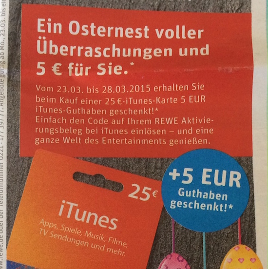 Zu Beginn der Woche gibt es wieder einmal gute Nachrichten für alle Schnäppchenjäger: Es gibt wieder vergünstigte iTunes-Geschenkkarten. Dieses Mal sind es die Filialen der Supermarktkette REWE, die die Karten zum Sonderpreis verkaufen. Hier bekommt man in dieser Woche beim Kauf einer iTunes- oder AppStore-Karte mit einem aufgedruckten Wert von € 25,- einen einen zusätzlichen Gutscheincode in Höhe von € 5,- gratis obendrein. Diesen findet man nach dem Kauf auf dem Einkaufsbeleg. Aber Achtung: Die Aktion gilt nur bis Samstag, den 28. März 2015 bzw. solange der Vorrat reicht. Die Anzahl der Karten pro Kunde und Einkauf ist anscheinend nicht begrenzt. man sollte also im Zweifel schnell sein, um noch die eine oder andere Karte abzugreifen. Sowohl der aufgedruckte Wert der Karten, als auch der Zusatzcode kann sowohl für Musik, als auch für Fernsehserien, Filme und Einkäufe im Mac- und iOS-AppStore genutzt werden. (mit Dank an Philipp!)
