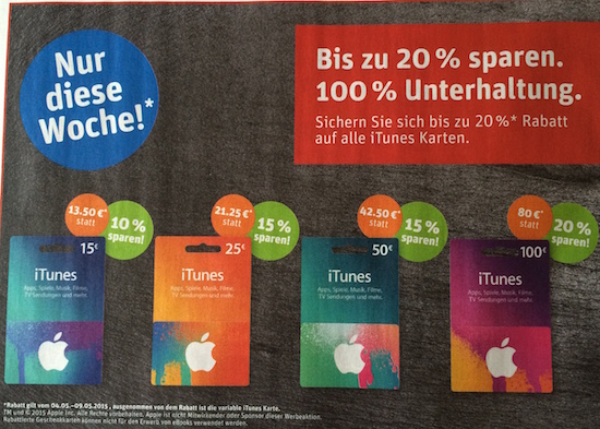 Achtung: Leider kann ich die Hinweise auf die günstigen iTunes-Karten nicht in jedem einzelnen Fall überprüfen. Checkt daher bitte vorher noch einmal ab, ob die jeweilige Filliale den Rabatt auch tatsächlich gewährt!