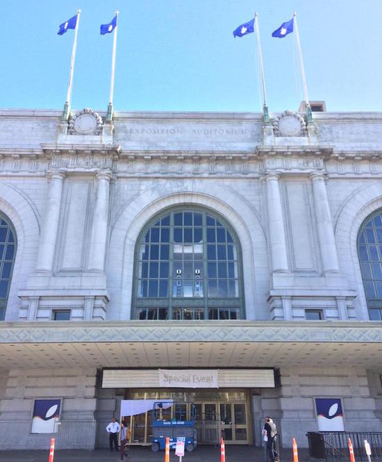 Nebenbei hat Apple übrigens inzwischen damit begonnen, die Event-Location zu dekorieren, wie diverse Fotos auf Twitter inzwischen dokumentieren. Unter anderem wehen rund um das Bill Graham Civic Auditorium inzwischen diverse Apple-Fahnen und auch die Fassade wird inzwischen von verschiedenen Postern im Design der Event-Einladung geschmückt.