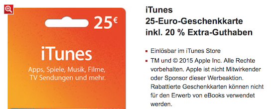 Achtung: Leider kann ich die Hinweise auf die günstigen iTunes-Karten nicht in jedem einzelnen Fall überprüfen. Checkt daher bitte vorher noch einmal ab, ob die jeweilige Filliale den Rabatt auch tatsächlich gewährt!
