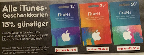 Achtung: Leider kann ich die Hinweise auf die günstigen iTunes-Karten nicht in jedem einzelnen Fall überprüfen. Checkt daher bitte vorher noch einmal ab, ob die jeweilige Filliale den Rabatt auch tatsächlich gewährt!