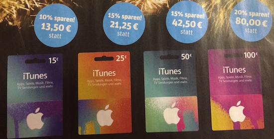 Achtung: Leider kann ich die Hinweise auf die günstigen iTunes-Karten nicht in jedem einzelnen Fall überprüfen. Checkt daher bitte vorher noch einmal ab, ob die jeweilige Filliale den Rabatt auch tatsächlich gewährt!