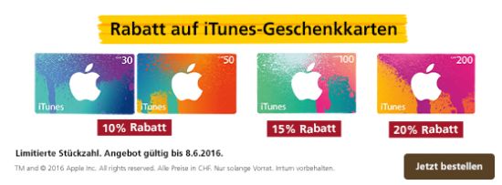 Während sich iTunes-Kunden hierzulande über die Rabatt-Aktionen auf die beliebten Geschenkkarten bei den Supermarktketten Marktkauf und EDEKA, sowie der Drogeriemarktkette Rossman freuen, können aktuell auch Kunden der Deutschen Bank und Nutzer aus der Schweiz sparen. So berichtet mein Leser Holger, dass man bei der Deutschen Bank aktuell (und noch bis zum 02. Juni) 20% bei den Karten im Wert von € 25,-, € 50,- und € 100,- sparen kann. Christof ergänzt für meine schweizer Leser, dass der dortige Postshop (www.postshop.ch) derzeit gestaffelte Rabatte auf die iTunes-Geschenkarten gewährt. Dabei erhält man 10% auf die Karten um Wert von CHF 30,- und CHF 50,-. Bei den Karten im Wert von CHF 100,- sind es 15% und bei den Karten im Wert von CHF 200,- gar 20%. Aber Achtung: Die Aktion gilt nur bis Mittwoch, den 08. Juni 2016, bzw. solange der Vorrat reicht. Die Anzahl der Karten pro Kauf ist anscheinend nicht begrenzt. Man sollte also im Zweifel schnell sein, um noch rechtzeitig zuschlagen zu können. Schließlich haben die Karten ja kein Verfallsdatum. Der aufgedruckte Wert der Karten kann sowohl für Musik, als auch für Fernsehserien, Filme und Einkäufe im Mac- und iOS-AppStore genutzt werden. (vielen Dank an die beiden Tippgeber!)