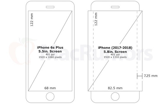 Angeblich hat Apple bereits OLED-Displays in einer Größe von 5,8" bei Samsung in Auftrag gegeben. Die neue Größe soll dabei nicht für ein abermals größeres Display in der Fläche genutzt werden, sondern dazu dienen, auch die Ränder des 5,5"-iPhone entsprechend zu belegen, wie es die folgende Schemazeichnung der Kollegen von MacRumors darstellt.