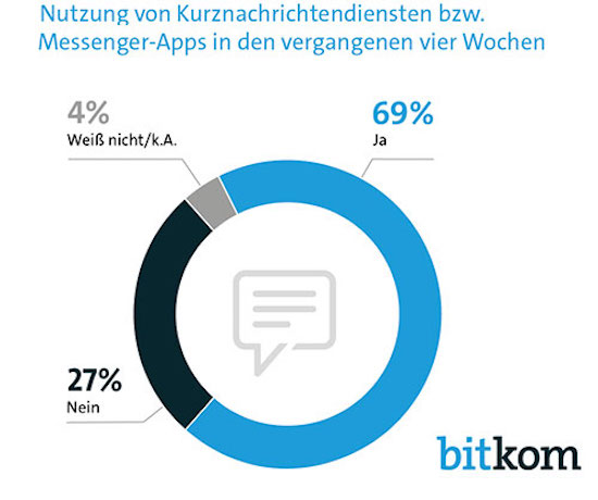 Auch die weiteren Ergebnisse der Umfrage sind interessant. So nutzen inzwischen mit 69% gut zwei Drittel der deutschen Internetnutzer einen Messenger-Dienst. Vor allem bei der jüngeren Bevölkerung sind diese beliebt. Satte 82% der 14- bis 29-jährigen sind hier mit WhatsApp und Co. unterwegs. Bei der darauf folgenden Gruppe der 30- bis 49-jährigen sind es immerhin noch 81%. Anschließend nimmt die Nutzung von den 50- bis 64-Jährigen mit 59% bis zu den über 65-jährigen auf 28 Prozent% weiter ab.