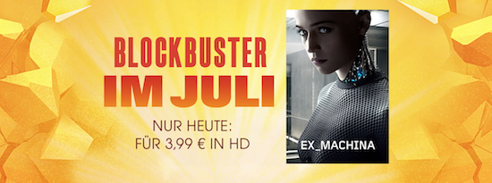 Apple versüßt allen Filmfans den diesjährigen Juli mit einer besonderen Aktion im iTunes Store. Unter dem Motto "Blockbuster im Juli" wird dabei jeden Tag ein neuer Film im iTunes Store für 24 Stunden auf lediglich noch € 3,99 im Preis gesenkt. Hierfür erhält man dann die Kaufversion des Titels in HD-Qualität. Am heutigen Tag handelt es sich dabei um den Sci-Fi Thriller Ex_Machina (€ 3,99 bei iTunes). Wer mit dem Film so erstmal nichts anfangen kann, sollte zumindest mal einen Blick in den Trailer werfen - sehr spannend! Selbst wenn man aktuell keine Zeit hat, sich den Streifen zu Gemüte zu führen, kann ein Zuschlagen bei diesem Preis nicht schaden. Da es sich um die Kaufversion handelt, kann man den Film nach dem Kauf schauen wann man will und ihn auch jederzeit aus iCloud erneut kostenlos herunterladen. Viel Spaß!