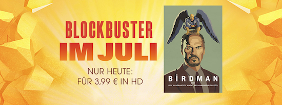 Apple versüßt allen Filmfans den diesjährigen Juli mit einer besonderen Aktion im iTunes Store. Unter dem Motto "Blockbuster im Juli" wird dabei jeden Tag ein neuer Film im iTunes Store für 24 Stunden auf lediglich noch € 3,99 im Preis gesenkt. Hierfür erhält man dann die Kaufversion des Titels in HD-Qualität. Am heutigen Tag handelt es sich dabei um den oscarprämierten Independent-Film Birdman (€ 3,99 im iTunes Store) mit Michael Keaton. Selbst wenn man aktuell keine Zeit hat, sich den Streifen zu Gemüte zu führen, kann ein Zuschlagen bei diesem Preis nicht schaden. Da es sich um die Kaufversion handelt, kann man den Film nach dem Kauf schauen wann man will und ihn auch jederzeit aus iCloud erneut kostenlos herunterladen. Viel Spaß!