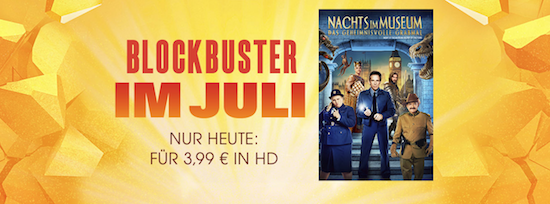 Apple versüßt allen Filmfans den diesjährigen Juli mit einer besonderen Aktion im iTunes Store. Unter dem Motto "Blockbuster im Juli" wird dabei jeden Tag ein neuer Film im iTunes Store für 24 Stunden auf lediglich noch € 3,99 im Preis gesenkt. Hierfür erhält man dann die Kaufversion des Titels in HD-Qualität. Am heutigen Tag handelt es sich dabei um die Komödie Nachts im Museum – Das geheimnisvolle Grabmal (€ 3,99 im iTunes Store) mit Ben Stiller und Robin Williams. Selbst wenn man aktuell keine Zeit hat, sich den Streifen zu Gemüte zu führen, kann ein Zuschlagen bei diesem Preis nicht schaden. Da es sich um die Kaufversion handelt, kann man den Film nach dem Kauf schauen wann man will und ihn auch jederzeit aus iCloud erneut kostenlos herunterladen. Viel Spaß!