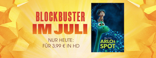 Apple versüßt allen Filmfans den diesjährigen Juli mit einer besonderen Aktion im iTunes Store. Unter dem Motto "Blockbuster im Juli" wird dabei jeden Tag ein neuer Film im iTunes Store für 24 Stunden auf lediglich noch € 3,99 im Preis gesenkt. Hierfür erhält man dann die Kaufversion des Titels in HD-Qualität. Am heutigen Tag handelt es sich dabei um den Pixar-Animationsfilm Arlo & Spot (€ 3,99 im iTunes Store). Selbst wenn man aktuell keine Zeit hat, sich den Streifen zu Gemüte zu führen, kann ein Zuschlagen bei diesem Preis nicht schaden. Da es sich um die Kaufversion handelt, kann man den Film nach dem Kauf schauen wann man will und ihn auch jederzeit aus iCloud erneut kostenlos herunterladen. Viel Spaß!