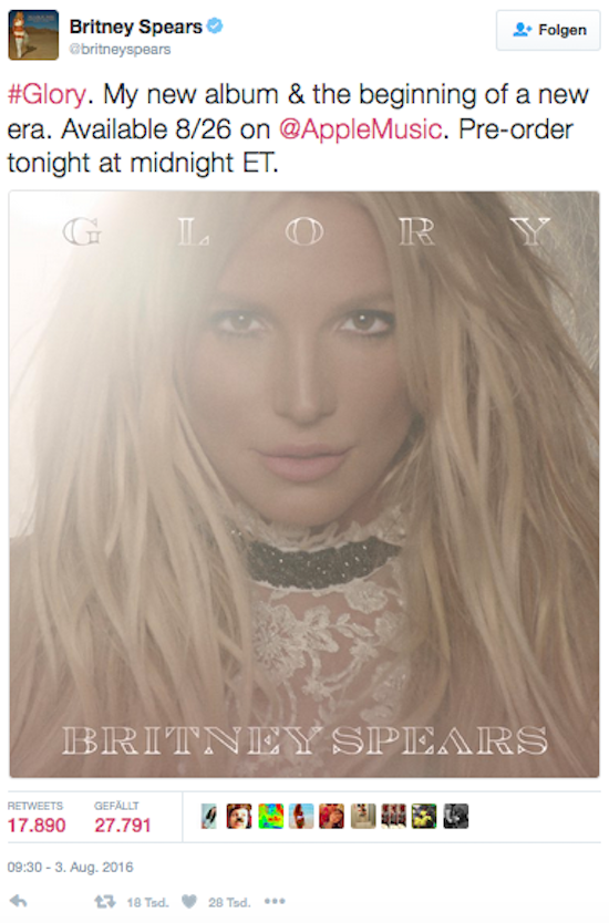 Apple peitscht seinen Musik-Streamingdienst Apple Music weiter voran. Während zuletzt die möglicherweise geplante Übernahme des Konkurrenten Tidal für Schlagzeilen sorgte, weitet Apple den Dient nun auch auf Israel aus und konnte einen weiteren exklusiven Deal landen. So hat Britney Spears bekannt gegeben, dass ihr neues Album "Glory", das erste seit drei Jahren, ab dem 26. August exklusiv bei Apple Music verfügbar sein wird. Darüber hinaus wird das neue Album auch in Kürze exklusiv über den iTunes Store vorbestellbar sein.