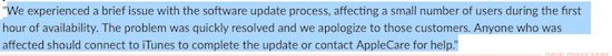 Inzwischen hat Apple ein Statement zu dem Thema abgegeben, in dem man das Problem eingesteht. Inzwischen soll dieses allerdings wieder behoben sein.