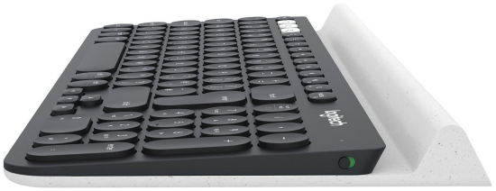 Betrieben wird die Bluetooth-Tastatur mit zwei im Lieferumfang enthaltenen AAA-Batterien, mit denen sie je nach Nutzung bis zu 24 Monate durchhalten soll. Der Clou besonders für Smartphone- und Tablet-Nutzer ist dabei eine gummierte Nut oberhalb der Tastatur, in der sich das jeweilige Gerät in einem angenehmen Winkel platzieren lässt, so dass man durchaus den Effekt eines echten Notebooks bekommt. Unterstützt werden dabei Geräte bis zu einer Größe von 12,9", also der des iPad Pro. Verwendet man ein kleineres Tablet, lässt sich daneben sogar noch ein Smartphone platzieren. Die Logitech K780 kann sich per Bluetooth Smart mit bis zu drei Geräten gleichzeitig verbinden. So kann man beispielsweise gleichzeitig den Mac, das iPhone und das iPad gekoppelt haben. Um zwischen den Geräten zu wechseln, genügt ein einfacher Tastendruck.