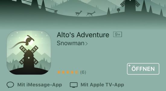 Apples Ansatz, über sogenannte "Universal Apps" den Entwicklern die Möglichkeit zu geben, mit nur einer App-Datei sowohl das iPhone, als auch das iPad und Apple TV und inzwischen sogar den iMessage AppStore bedienen zu können, ist nach wie vor großartig. Inzwischen spiegelt auch der iOS-AppStore all diese Möglichkeiten visuell wider, wie die Kollegen vom iPhone-Ticker herausgefunden haben. So zeigt der AppStore auf dem iPhone und iPad inzwischen nicht nur die auf den mobilen Geräten verfügbaren Varianten als Screenshot an, sondern auch die Ansicht auf dem Apple TV, sowie die möglichen iMessage-Erweiterungen. Unten ein Beispiel aus dem äußerst empfehlenswerten Alto's Adventure (€ 1,99 im AppStore).