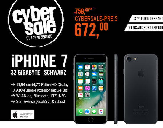 Während der Black Friday mit großen Schritten näher kommt, lassen sich schon in den Tagen zuvor größere Rabatte auf die verschiedensten Produkte abstauben. Während beispielsweise bei Amazon bereits die Cyber Monday Week oder bei Saturn die Black Week laufen, hat der Apple-Fachhändler Cyberport nur heute und nur in limitierter Stückzahl das iPhone 7 mit 32 GB Speicherkapazität in schwarz vergünstigt abzugeben. Hier zahlt man derzeit nur € 672,- bei einer versandkostenfreien Lieferung für das Netlock-freie iPhone 7. Insgesamt stehen für die Aktion nur 400 Geräte zur Verfügung. Sollte man also noch Bedarf haben, sollte man sich beeilen. Der folgende Link führt direkt zu der Aktion: iPhone 7, 32 GB, schwarz bei Cyberport
