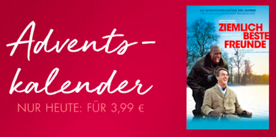 Apple versüßt allen Filmfans den diesjährigen Dezember mit einer besonderen Aktion im deutschen iTunes Store. In Form eines "Adventskalenders" wird dabei bis zum 24. Dezember jeden Tag ein neuer Film im iTunes Store für 24 Stunden auf lediglich noch € 3,99 im Preis gesenkt. Hierfür erhält man dann die Kaufversion des Titels in HD-Qualität. Am heutigen Tag der Aktion handelt es sich dabei um die durch und durch empfehlenswerte Komödie Ziemlich beste Freunde (€ 3,99 im iTunes Store). Selbst wenn man aktuell keine Zeit hat, sich den Streifen zu Gemüte zu führen, kann ein Zuschlagen bei diesem Preis nicht schaden. Da es sich um die Kaufversion handelt, kann man den Film nach dem Kauf schauen wann man will und ihn auch jederzeit aus iCloud erneut kostenlos herunterladen. Viel Spaß!