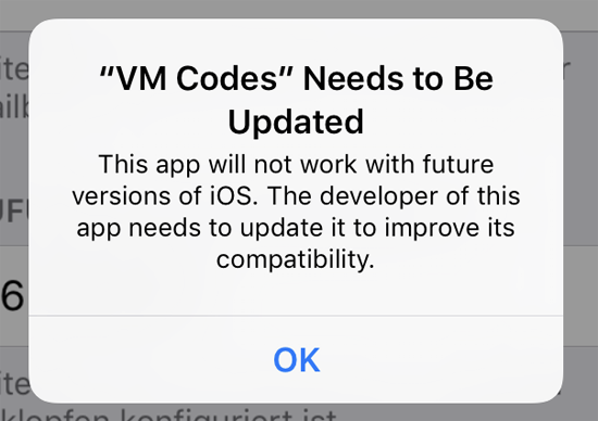 So enthält die erste Beta von iOS 10.3 inzwischen einen anderen Wortlaut bei dem eingeblendeten Hinweis, der nahelegt, dass ab dem Herbst dieses Jahres nur noch 64-Bit Apps unterstützt werden. So heißt es in der Warnmeldung ab iOS 10.3: "[App]" Needs to Be Updated - This app will not work with future versions of iOS. The developer of this app needs to update it to improve its compatibility."