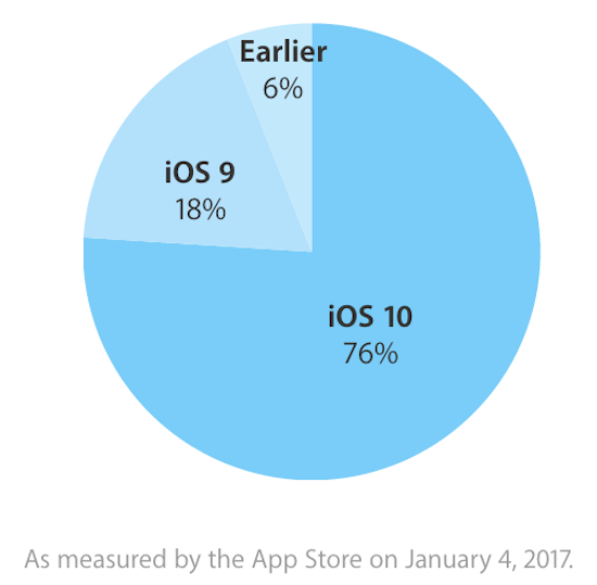 Seit ungefähr vier Monaten lässt sich die aktuellste Version von Apples mobilem Betriebssystem iOS 10 inzwischen laden, nun hat Apple mal wieder offizielle Installationszahlen dazu veröffentlicht. Demnach läuft iOS 10 bereits auf 76% aller aktiven iOS-Geräte. Diese Zahl misst Apple auf Basis der Zugriffe im AppStore. Damit konnte iOS 10 vor allem über die Feiertage kräftig zulegen und zwischen Ende November und Anfang Januar noch einmal um satte 13% zulegen. Die restlichen Anteile verteilen sich auf iOS 9 mit noch 18% und iOS 8 und früher mit den restlichen 6%. Zum Vergleich: Im vergangenen Jahr war iOS 9 zum vergleichbaren Zeitpunkt auf 75% der aktiven Geräte installiert und konnte somit eine ähnliche Adaptionsrate aufweisen.
