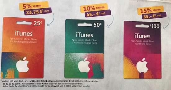 Achtung: Leider kann ich die Hinweise auf die günstigen iTunes-Karten nicht in jedem einzelnen Fall überprüfen. Checkt daher bitte vorher noch einmal ab, ob die jeweilige Filliale den Rabatt auch tatsächlich gewährt!