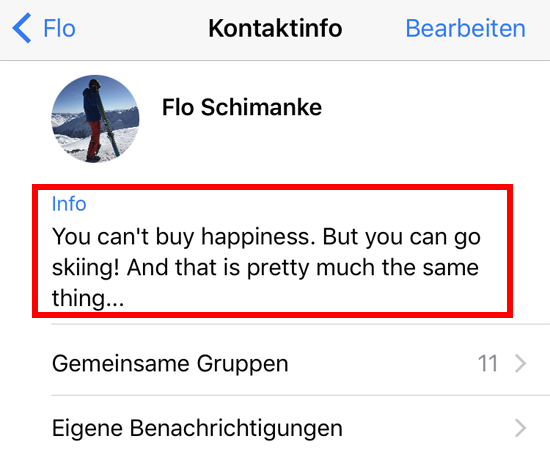 Mit der Einführung seiner neuen Statusansicht in Form von nach einer Zeit wieder verschwindenden Bildern, die frappierend an die Kernfunktion von Snapchat (kostenlos im AppStore) erinnert, hat sich WhatsApp (kostenlos im AppStore) nicht nur Freunde gemacht. Im Gegenteil, viele Nutzer wünschten sich den einfachen Textstatus zurück. Und wenn ich ab und zu mal auf den Status-Reiter in meiner WhatsApp-Installation geschaut habe, tauchten da auch immer nur ein, zwei verträumte Bilder auf. Kurzum: Der neue Status war ein Schlag ins Wasser. Immerhin haben die Entwickler dies ganz offensichtlich eingesehen. Mit dem in der vergangenen Nacht erschienenen Update auf Version 2.17.10 kehrt der Textstatus nun wieder zurück. Dabei hat WhatsApp sogar den zuletzt gespeicherten Status erhalten, so dass dieser nun wieder direkt zur Verfügung steht. Um ihn zu editieren, begibt man sich in dei Einstellungen, tippt dort auf den eigenen Nutzernamen und findet dort nun ein Feld namens "Info", hinter dem sich der Status verbirgt. Dieser wird künftig auch unter den Namen in der WhatsApp-Kontaktliste angezeigt und findet sich fortan auch wieder im Profil des jeweiligen Nutzers.