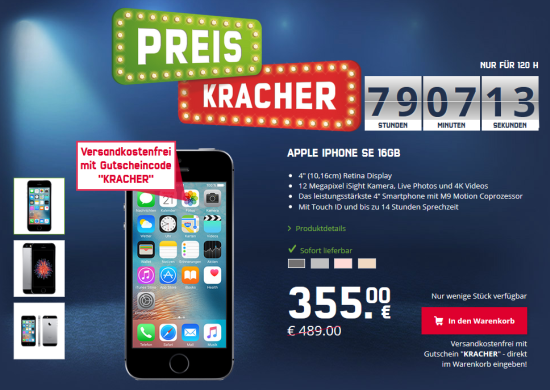 Aus gegebenem Anlass an dieser Stelle kurz ein schneller Schnäppchen-Hinweis. Falls man aktuell noch auf der Suche nach einem 4"-iPhone ist, bietet sich ein Abstecher zu mobilcom-debitel an. Hier wird derzeit nämlich das iPhone SE im Rahmen der "Preis-Kracher Frühlingsaktion" zum absoluten Tiefstpreis angeboten. Dabei bekommt man das Gerät in allen vier Farben mit 16 GB Speicherkapazität für nue € 355,- statt der normalerweise veranschlagten € 489,-. Das Angebot gilt allerdings nur solange der Vorrat reicht und maximal noch bis Sonntag. Gibt man beim Bezahlvorgang dazu auch noch den Rabattcode "KRACHER" ein, entfallen zudem auch noch die Versandkosten. Der folgende Link führt direkt zum Angebot bei mobilcom-debitel: iPhone SE als Preis-Kracher