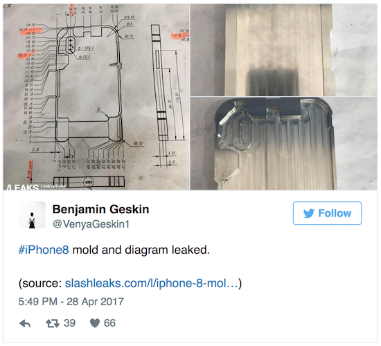 Der Strom an Gerüchten zum iPhone 8 reißt einfach nicht ab. Hauptquelle ist derzeit der bereits in den vergangenen Tagen mit Schemazeichnungen und verschiedenen Bildern von Dummys in Erscheinung getretene Benjamin Geskin, der nun mit einer angeblichen Fräsform für das iPhone 8 aufwartet. Dabei präsentiert er drei Fotos, von denen zwei die mutmaßliche CNC-Form zeigen, die verschiedene in den vergangenen Tagen dieskutierte Merkmale aufweist. Selbstverständlich ist nicht klar, ob es sich hierbei um eine echte Form handelt und wenn ja, ius welchem Stadium der Produktion sie stammt. Ein weiteres Foto zeigt eine neue Schemazeichnung, die erneut eine vertikal angeordnete Dual Lens Kamera, einen Lightning-Anschluss und einen längeren Homebutton zeigt. Erneut ist auf der Rückseite, sowohl bei der Fräsform, als auch auf der neuen Schemazeichnung keine Spur von einem Touch ID Sensor zu sehen.