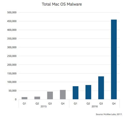 Der Mac oder besser gesagt macOS gilt nach wie vor als eines der sichersten Systeme auf dem Markt. Dennoch rückt auch die Apple-Plattform immer stärker in den Fokus von Angreifern und Hackern. Dies geht erneut auch aus dem aktuellen McAfee Threat Report hervor, der zeigt, dass Malware, die auf macOS uielt, im vergangenen Jahr um 744% gewachsen ist. Insgesamt wurden dabei ca. 460.000 verschiedene Schadprogramme gezählt. Bevor bei diesen Zahlen jedoch die große Panik ausbricht, muss erwähnt werden, dass die meisten dieser Programme weitestgehend ungefährlich sind und vor allem aus dem Bereich der Adware stammen. Hierbei handelt es sich um Werbeprogramme, die gemeinsam mit anderen Apps auf den Mac gelangen und dem Nutzer Werbung anzeigen. Die Anzahl der tatsächlich bedrohlichen Malware ist nach wie vor sehr gering.